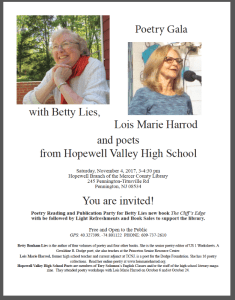 Publication Party for Betty Lies new book The Cliff’s Edge with readings by Lois Marie Harrod and Hopewell Valley High School Students, Saturday, November 4, 3 pm, Hopewell Branch of the Mercer County Library, 245 Pennington-Titusville Rd., Pennington, NJ, 08434. Free and open to the public.